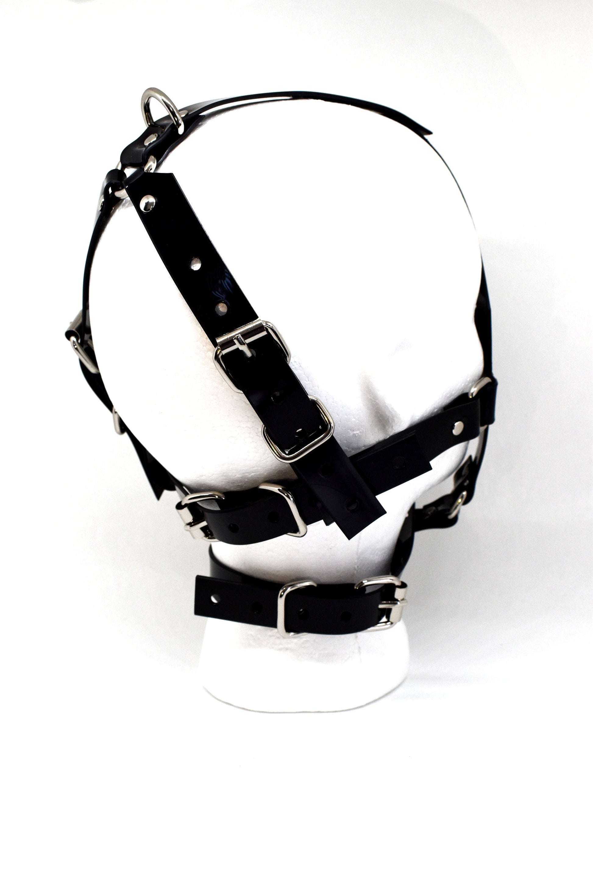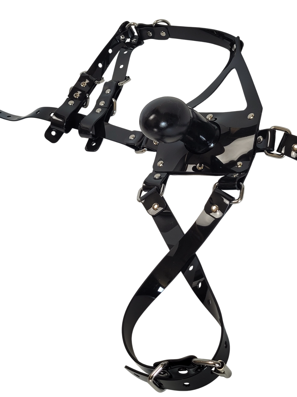 Muzzle ball gag made of Black PVC with a big panel from the forhead to the chin, very restrictive. Just behind this panel penis made of black silicon. Two ajustable strap behind the head, and two strap crossed under the chin to secure the jaw.